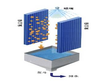將水霧噴向放電極和電暈區(qū),水霧在針刺電極形成的強大的電暈場內(nèi)荷電,電場力、荷電水霧的碰撞攔截、吸附凝并,共同對粉塵粒子起捕集作用, 終粉塵粒子在電場力的驅(qū)動下到達(dá)集塵極而被捕集。水在集塵極上形成連續(xù)的水膜,將捕獲的粉塵沖刷到灰斗中隨水排出。原理圖如下: